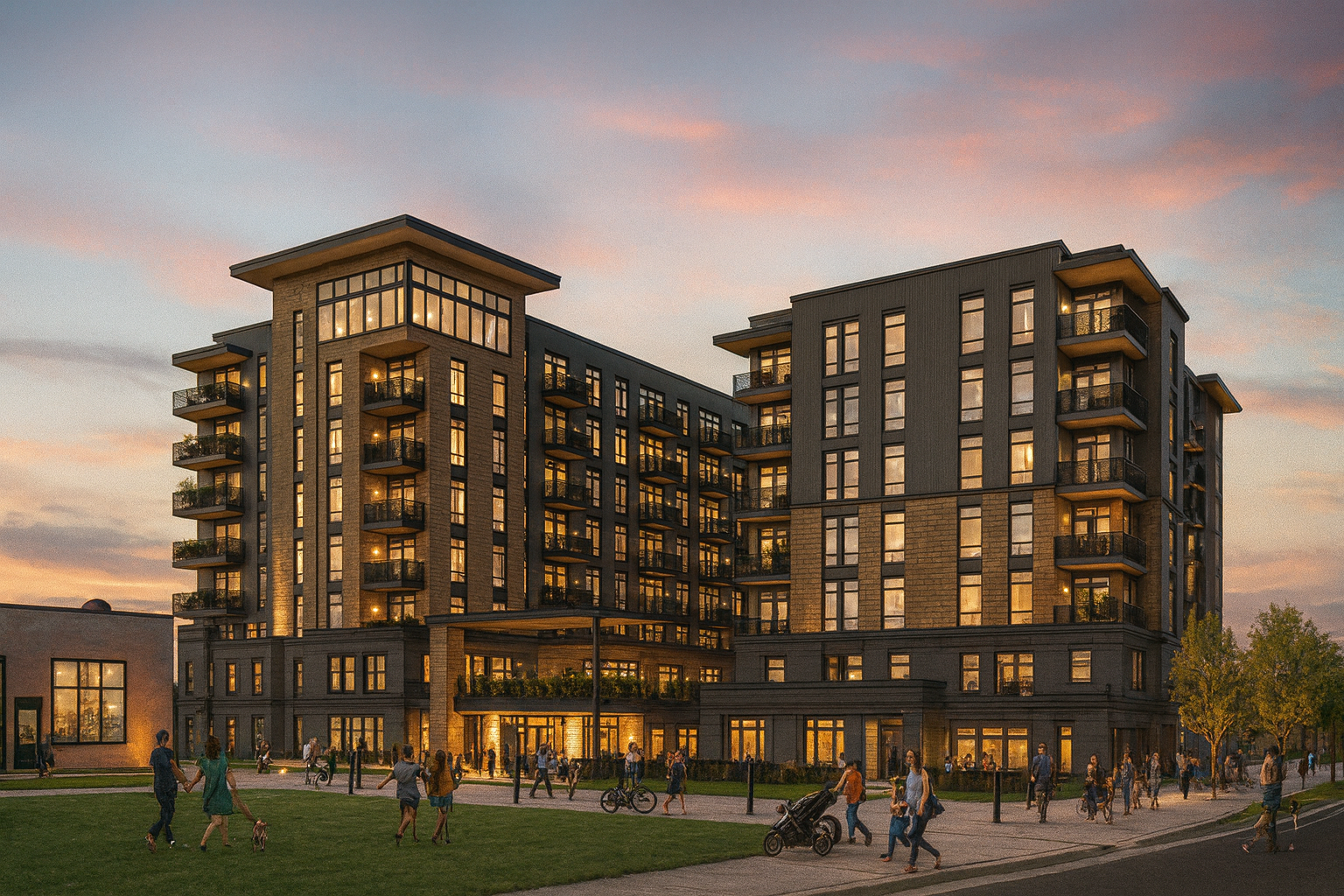With its highly walkable location, residents are steps away from local restaurants, shops, cultural landmarks, and the city’s renowned trail system. The ground-level façade has been thoughtfully scaled to enrich the pedestrian experience, while materials such as brick, steel, and glass create visual continuity with the surrounding historic buildings.