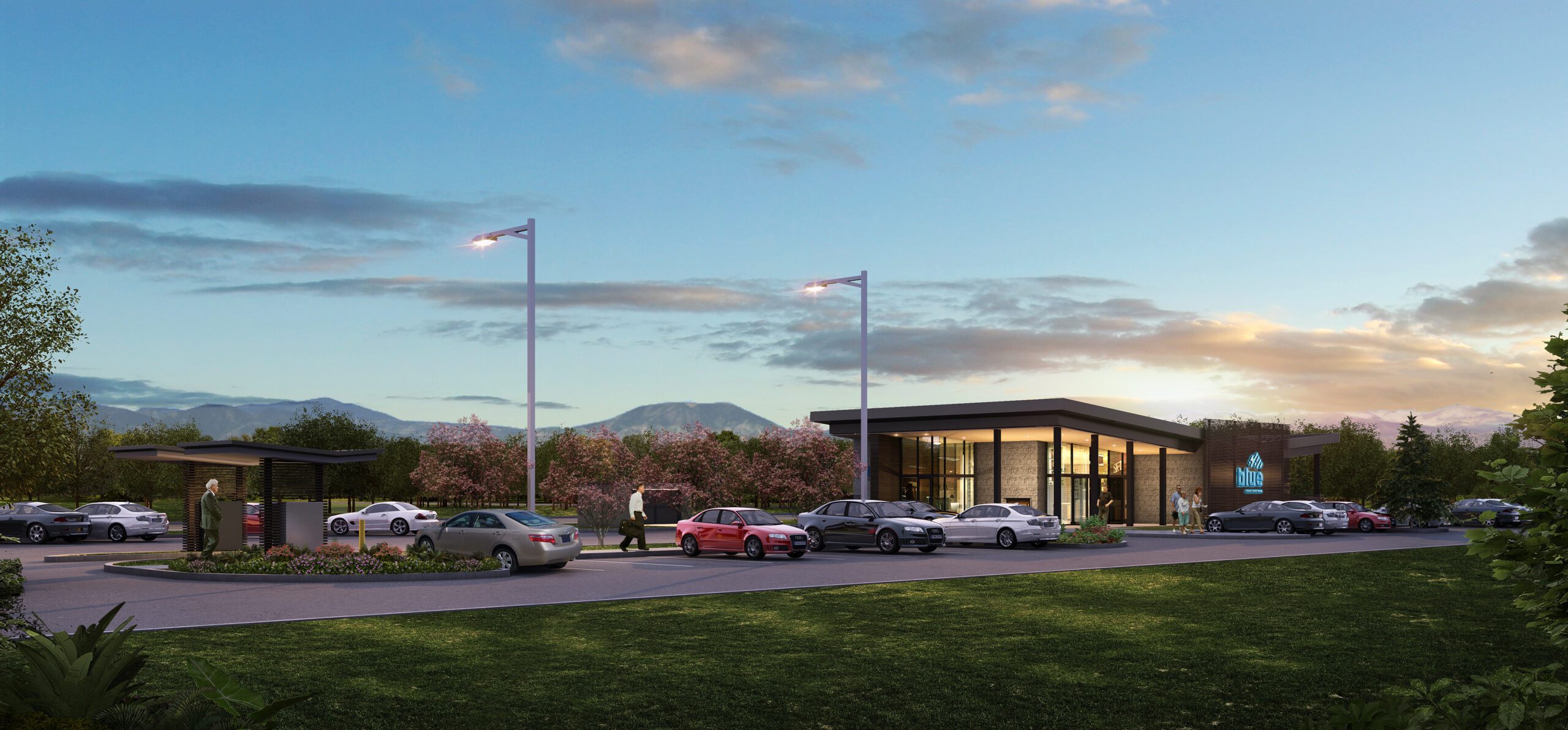 The Blue Federal Credit Union Lafayette Branch building is a 3,700 square foot branch office. The office was specifically designed to create an inviting experience for their customers and community members while maintaining a high level of security and privacy for staff. Lobby and coffee bar can be used by members of the public while the back half of the bank is securely locked and not accessible to the public for after-hours activities. With an according doors and a double-sided fireplace the lobby can open into the patio area and double the community space available. The form and materials selected for the branch are part of Blue’s overall branding.