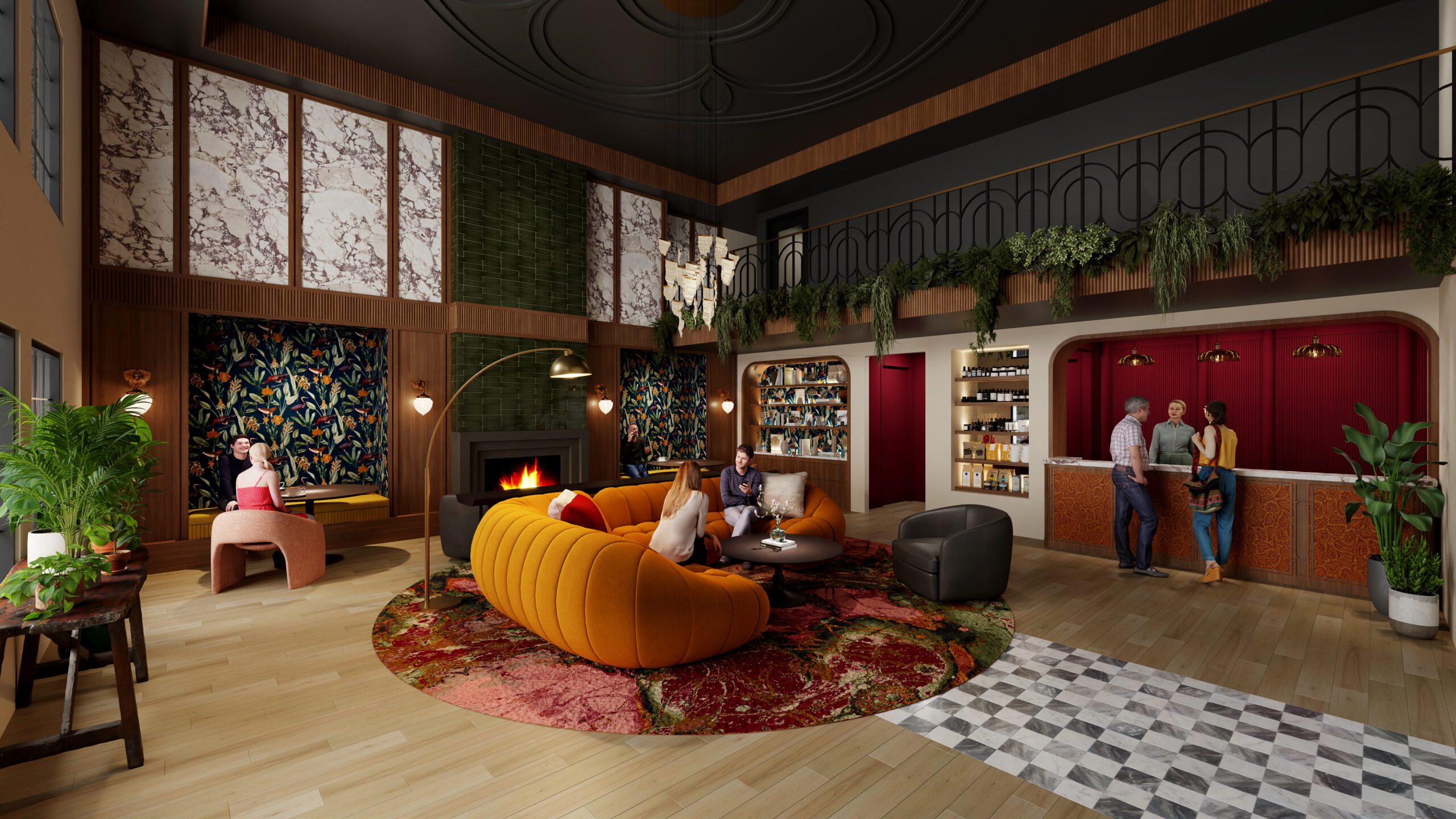 At the heart of the project is a complete overhaul of the hotel’s public spaces, including a dramatic new lobby that sets the tone for the Buxton’s playful yet refined identity. Warm textures, curated vintage details, and contemporary touches create a space that’s both welcoming and unforgettable.