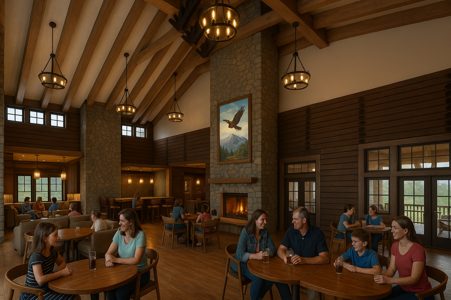 Strategically sited, the building is oriented to maximize expansive views across the course while capturing Kuna’s distinctive horizon lines and long western vistas. Large openings covered outdoor spaces, and carefully framed sightlines connect interior gathering areas to the surrounding landscape, reinforcing a strong indoor-outdoor relationship. Natural materials, textured surfaces, and a grounded palette help the building settle comfortably into its environment, allowing the architecture to complement—rather than compete with—the scenery.