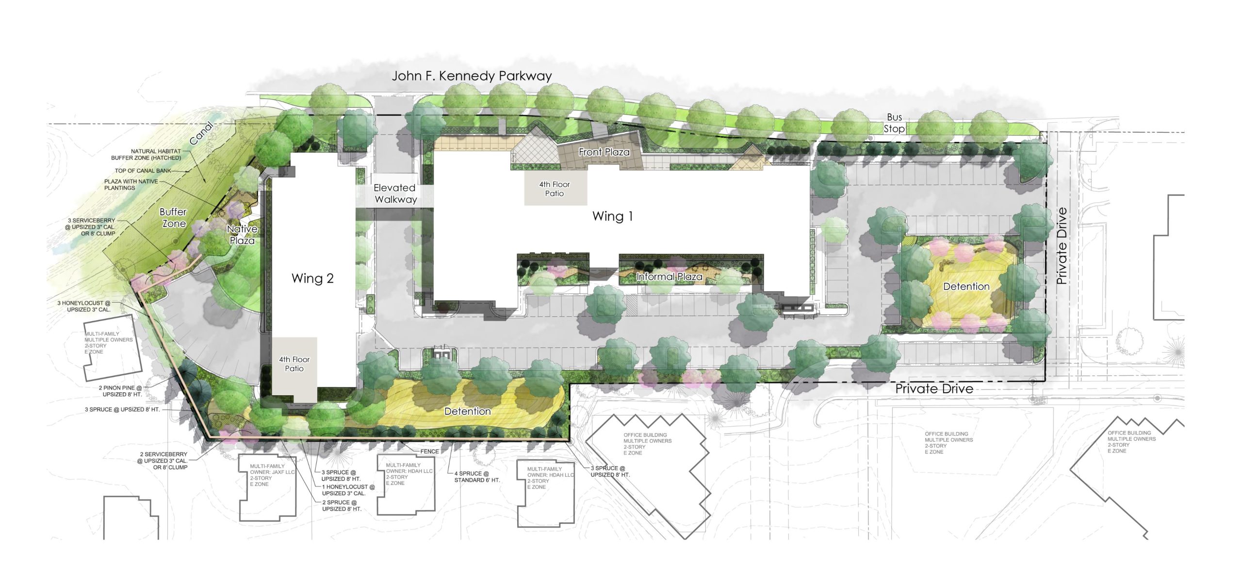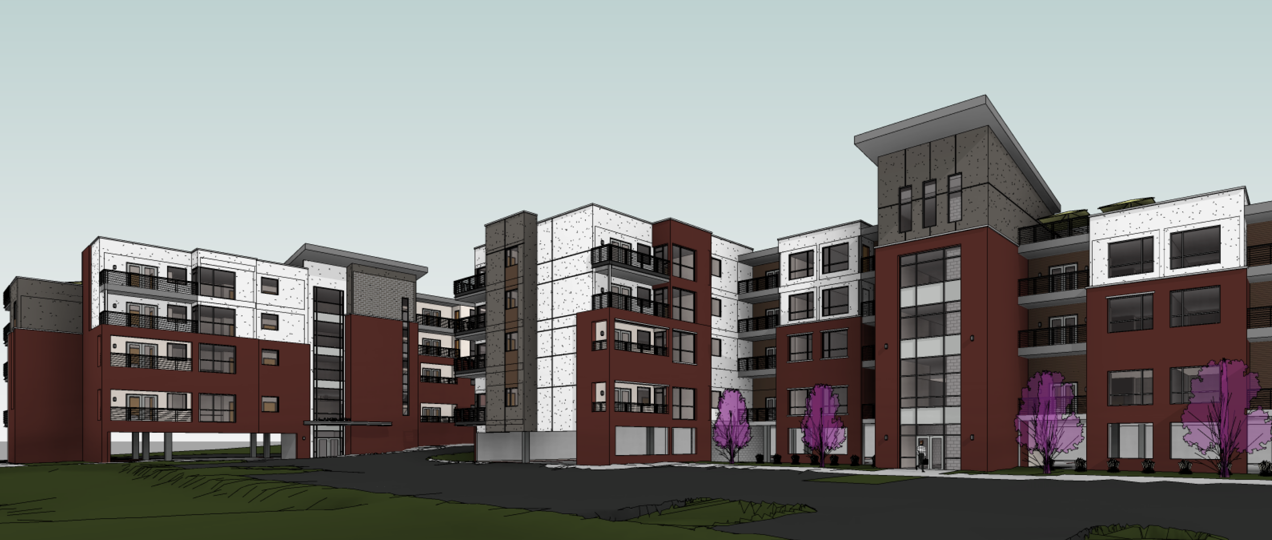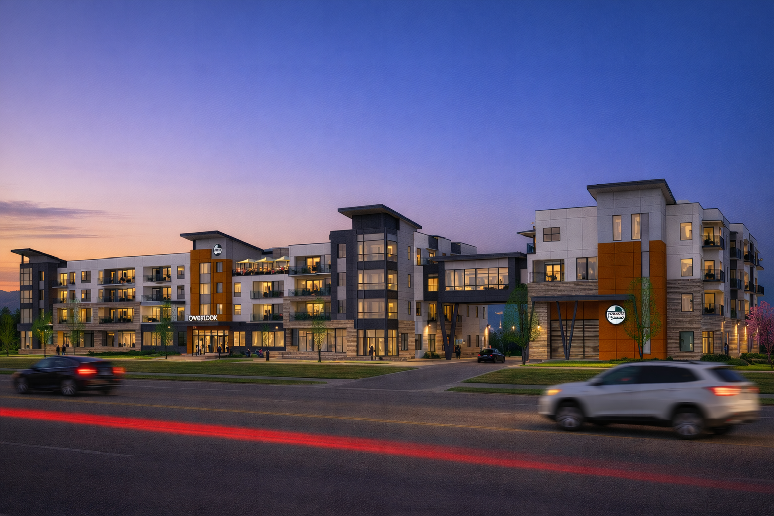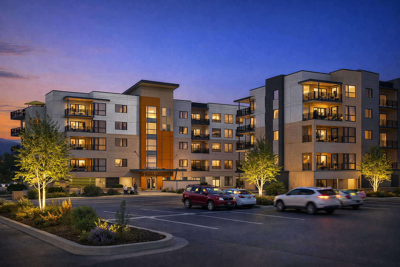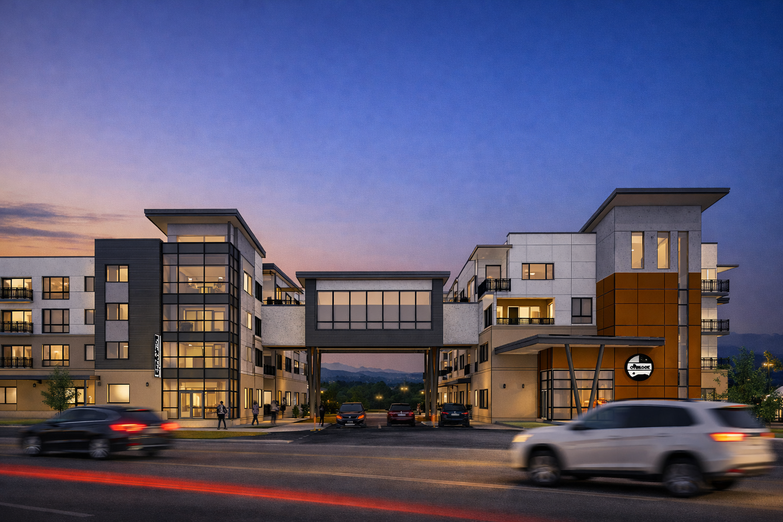 The architecture balances refined modern materials with warmth and texture, reflecting Fort Collins’ progressive character and its relationship to the Front Range. Ground-level covered parking is discreetly integrated into the site, providing convenience and weather protection while maintaining an active, pedestrian-friendly streetscape.