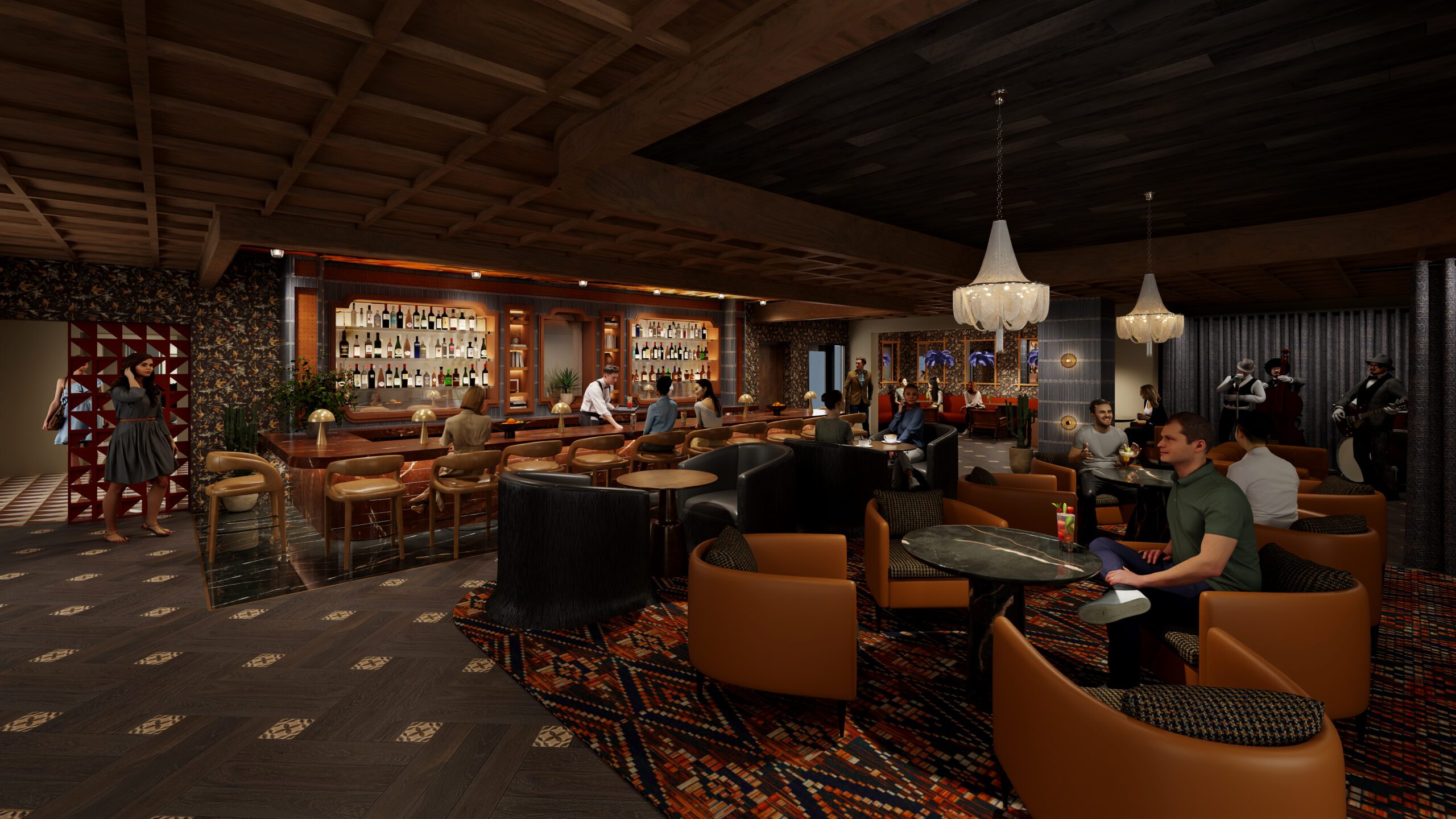 At the heart of the project is a complete overhaul of the hotel’s public spaces, including a dramatic new lobby that sets the tone for the Buxton’s playful yet refined identity. Warm textures, curated vintage details, and contemporary touches create a space that’s both welcoming and unforgettable.