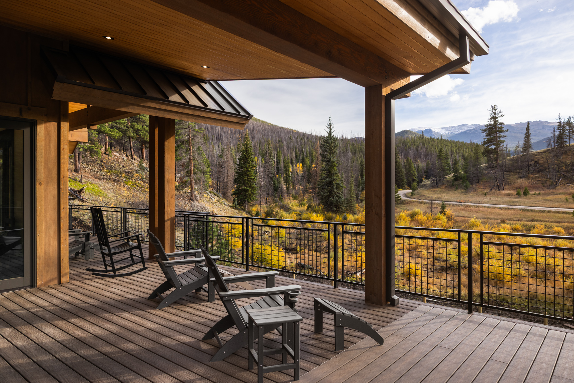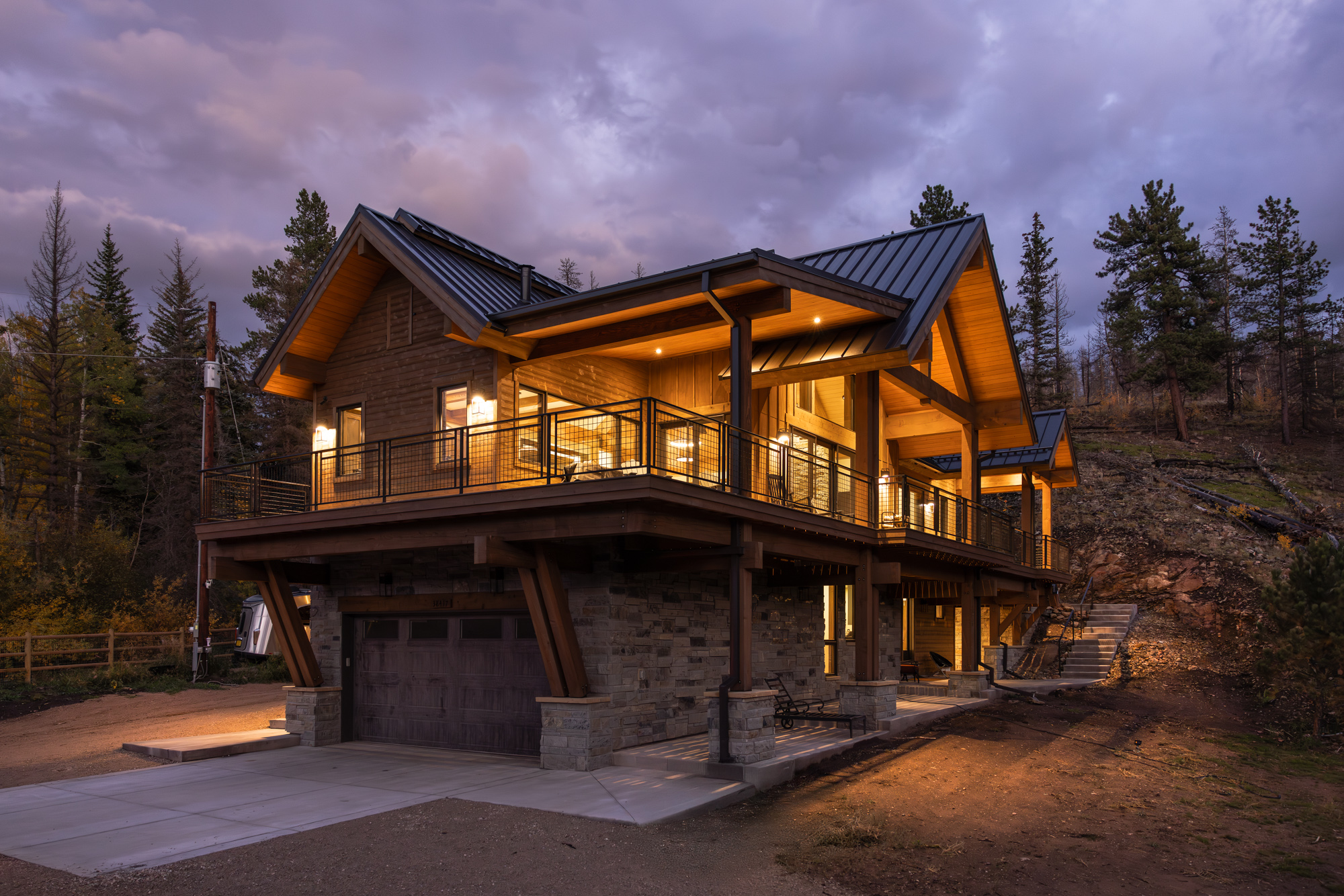 The timber clad structure and stone veneered foundation were selected to help the form settle into its surroundings. The timber frame bridges the exterior walls connecting the inside and outside. The interior spaces feature stunning views of the surrounding mountains from every room. There’s a cozy reading nook tucked under the stairs. Skylight was built into the deck above to allow more natural light in the bedroom below and an access to the hot tub area.